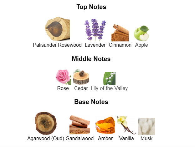 Les notes de tête sont Palissandre, Lavande, Cannelle et Pomme.