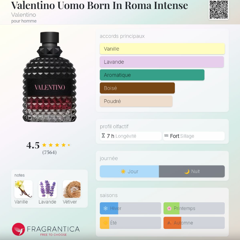 Valentino Uomo Born In Roma Intense de Valentino est un parfum oriental vanillé pour homme. C'est un nouveau parfum. Valentino Uomo Born In Roma Intense a été lancé en 2023. Valentino Uomo Born In Roma Intense a été créé par Antoine Maisondieu et Guillaume Flavigny. La note de tête est Vanille; la note de cœur est Lavande; la note de fond est Vétiver.